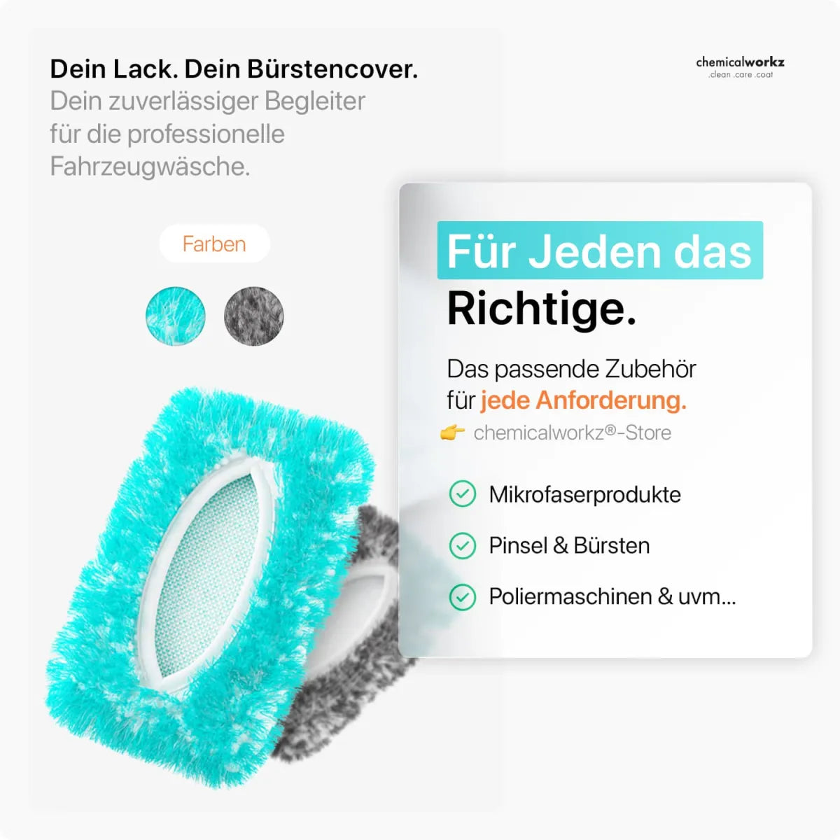 Alle chemicalworkz-producten zijn herbruikbaar, machinewasbaar en worden geleverd in een hersluitbare, milieuvriendelijke zip-verpakking. Hierdoor blijft jouw Wash Brush Cover altijd beschermd tegen vuil, stof, vocht en UV-straling.