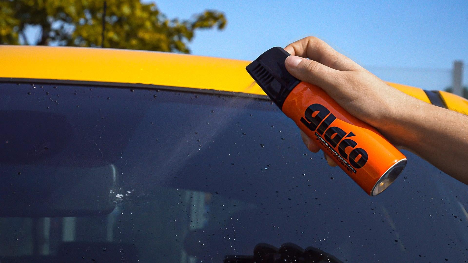 Spray Glaco W-Jet Strong gedurende ca. 3 seconden op de ruit terwijl het stevig regent.